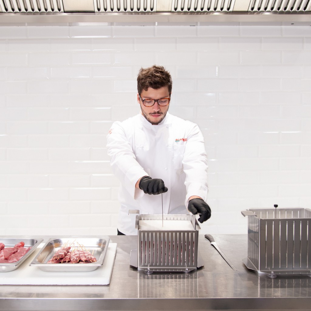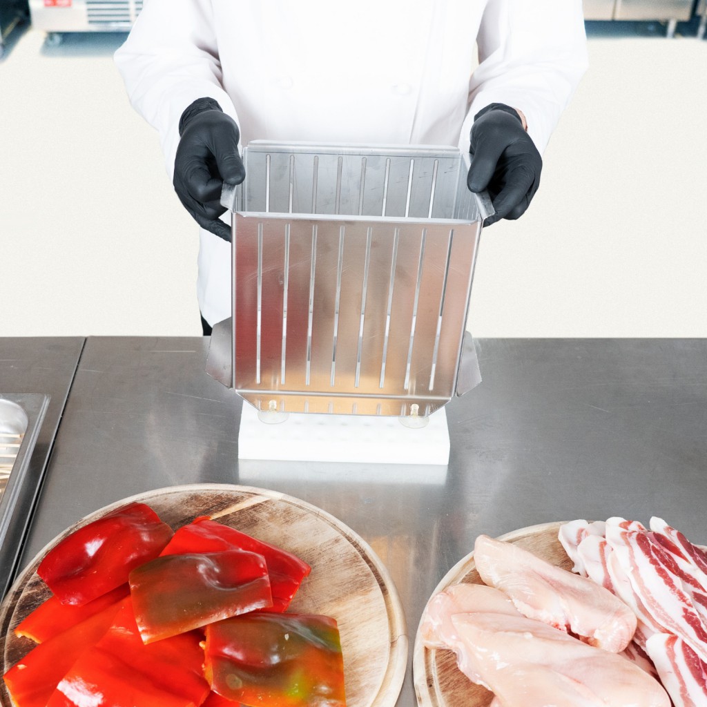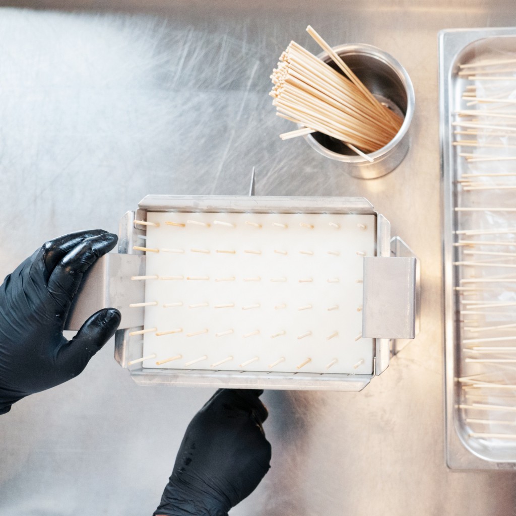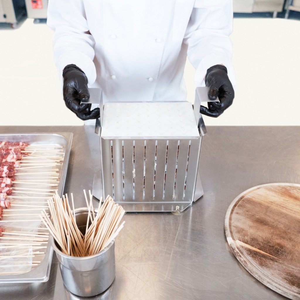 Met deze saté-rijgsnijder kunt u 54 satés per keer maken.Voor 54 sates, 25x25 mm